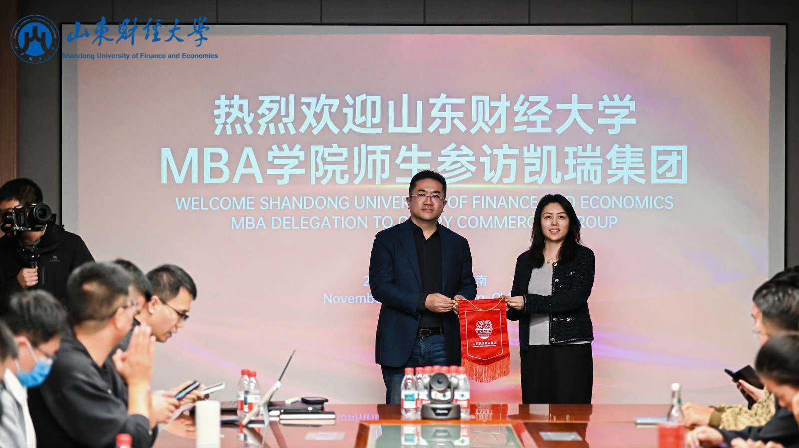 2025年11月15日,山东财经大学MBA学院《创业管理》课程社会实践活动走进山东凯瑞商业集团。MBA学院党委书记高峰、院长彭留英、社会服务部副主任史萌、鲁商案例中心副主任王强,《创业管理》课程组孔鹏志、齐齐带队,2024级近150名学员参加了此次访学活动。山东凯瑞集团董事长助理、行政管理中心总监高亚男,山东凯瑞商业集团董事长助理、市场营销中心总监侯明敬全程陪同参加了此次活动。