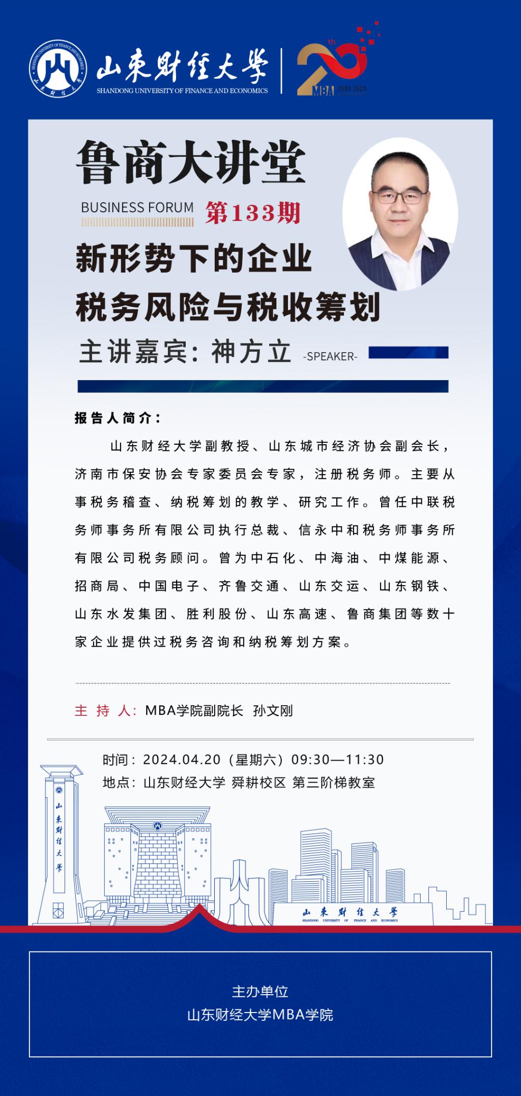 报告人:神方立主持人:MBA学院副院长 孙文刚时 间:2024年04月20日(星期六):09:30—11:30地 点:山东财经大学舜耕校区,第三阶梯教室报告人简介:山东财经大学副教授、山东城市经济协会副会长,济南市保安协会专家委员会专家,注册税务师。主要从事税务稽查、纳税筹划的教学、研究工作。曾任中联税务师事务所有限公司执行总裁、信永中和税务师事务所有限公司税务顾问。曾为中石化、中海油、中煤能源、招商局、中国电子、齐...