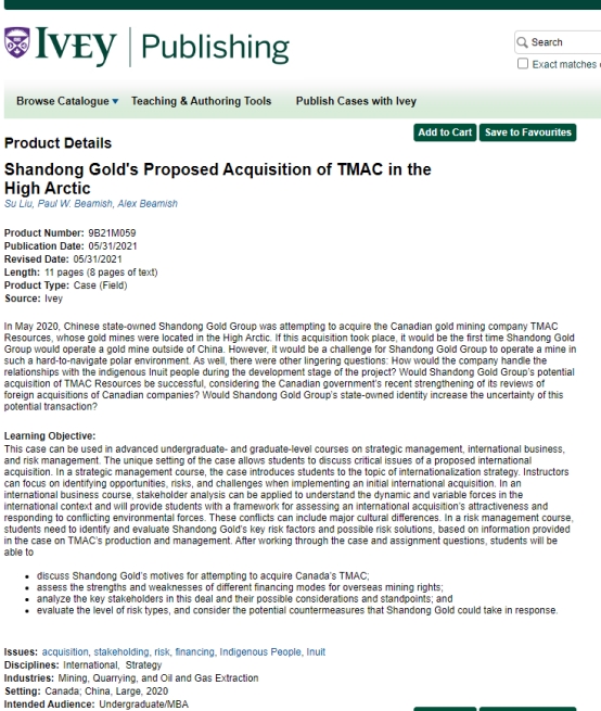 时间:2021年06月07日经过1年多的跟踪调研,我校刘素教授撰写的案例“SHANDONG GOLD’S PROPOSED ACQUISITION OF TMAC IN THE HIGH ARCTIC”(可译为山东黄金提议收购位于北极圈的TMAC公司)发表于国际知名的商业案例库Ivey Publishing。 该案例描述了山东黄金集团在试图收购一家经营陷入困境,位于北极圈的加拿大金矿公司TMAC中的所思所为。在这样一个极冷环境下经营一座金矿对于山东黄金而言也是一个挑战。此外,还有其他一系列的问题需要考...