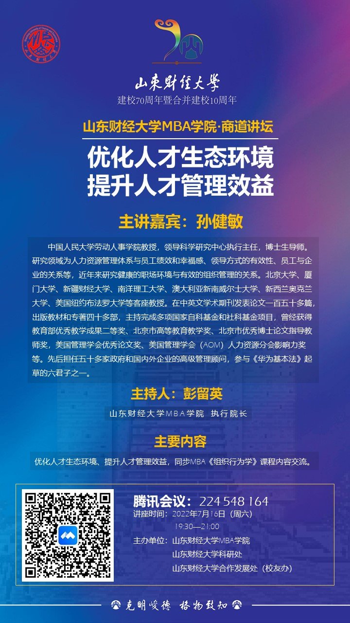 时间:2022年07月18日7月16日,MBA学院邀请中国人民大学孙健敏教授进做学术讲座,讲座题目为“优化人才生态环境,提升人才管理效益”。讲座采用视频会议形式,MBA学院执行院长彭留英教授主持了本次讲座。 学院《组织行为学》授课教师、在校MBA学生及往届校友近三百人参与线上学习与交流。 讲座直观生动地围绕“人才”徐徐展开,从山东的城市现象、人才政策切入,把握区分人才战略在区域、组织、个人不同层次和对象,积极为人才“松绑...