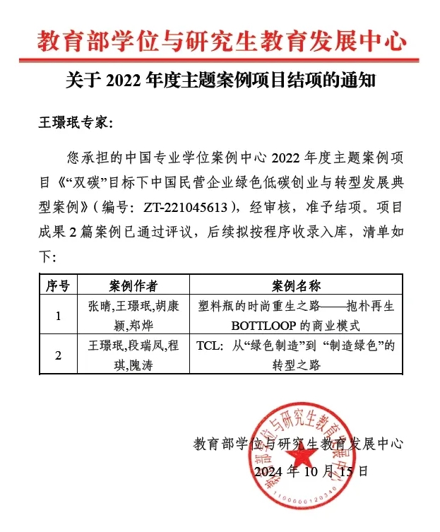 时间:2024年10月17日10月15日,MBA学院导师王璟珉教授承担的案例项目《“双碳”目标下中国民营企业绿色低碳创业与转型发展典型案例》成功通过教育部学位与研究生教育发展中心审核,准予结项。2023级MBA学员程琪和隗涛参与撰写的《TCL:从“绿色制造”到“制造绿色”的转型之路》成功入选。