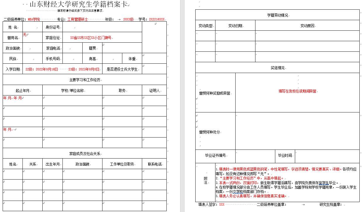 附件1:山东财经大学研究生学籍档案卡