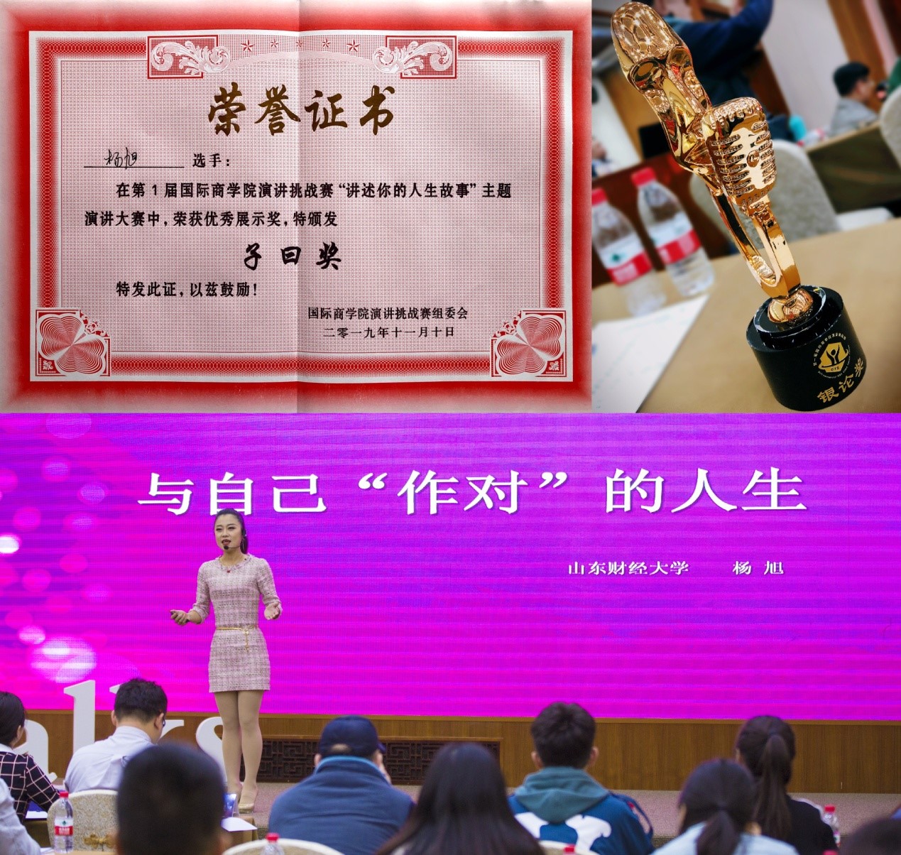 被学院推选参加首届国际商学院演讲挑战赛,没有演讲经理的我刻苦的写稿、改稿、背稿,通宵练习语调和台风。最终做到了在上百人面前自信的展示,并且获得了比赛的二等奖。如果不是读了山财MBA,我想我不会有这么好的机会,也可能会缺乏一点点参与的勇气。