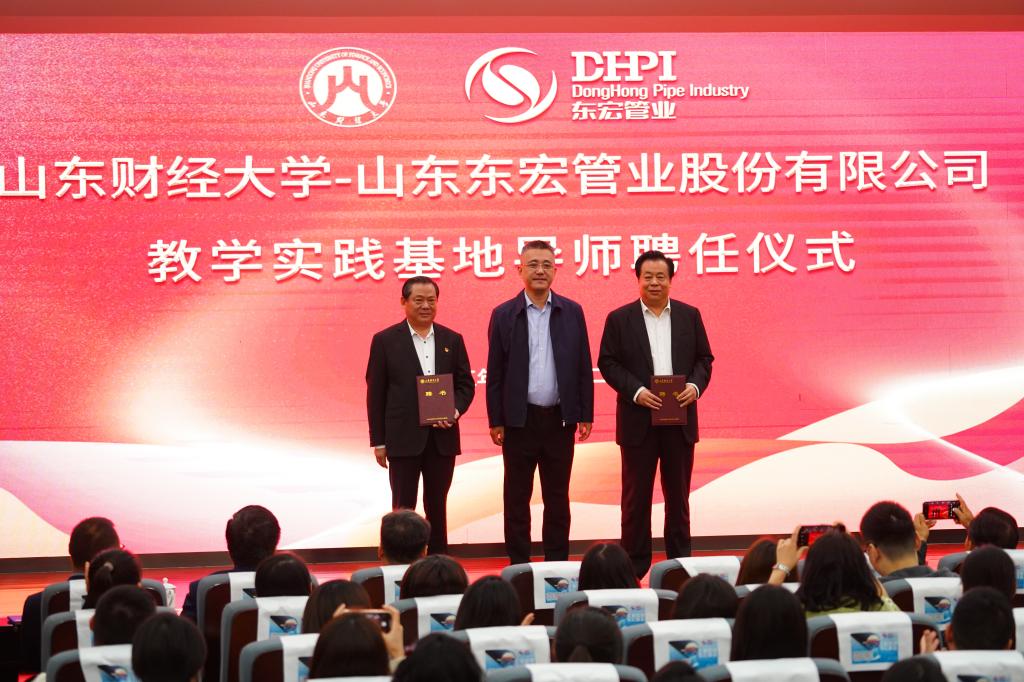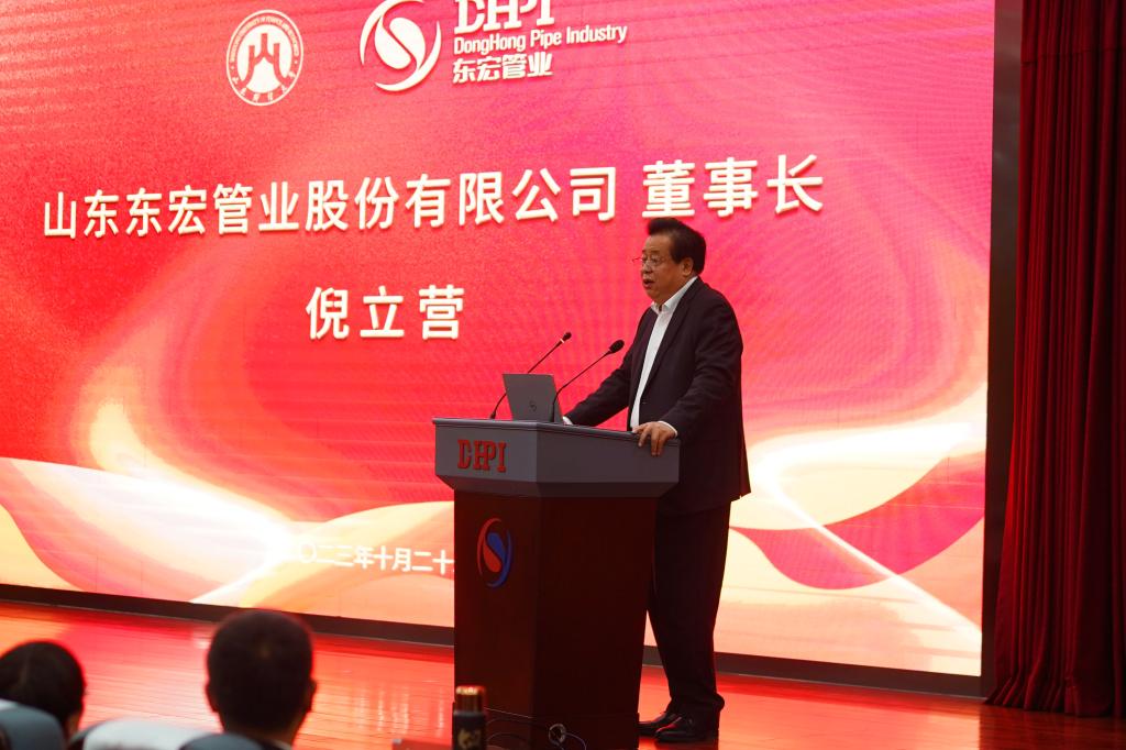 倪立营在致辞中指出,山东财经大学联合东宏管业成立MBA教学实践基地,是双方打通校企合作快车道、打造产教融合共同体的有力举措和务实行动。希望以此次揭牌仪式为新起点,借助山东财经大学的经管学科优势,充分发挥公司在国内复合管道行业的品牌和商业实践案例优势,打造多元合作机制,深化产教融合,实现资源共享、优势互补,为促进经济社会发展全面绿色转型做出新的更大贡献!