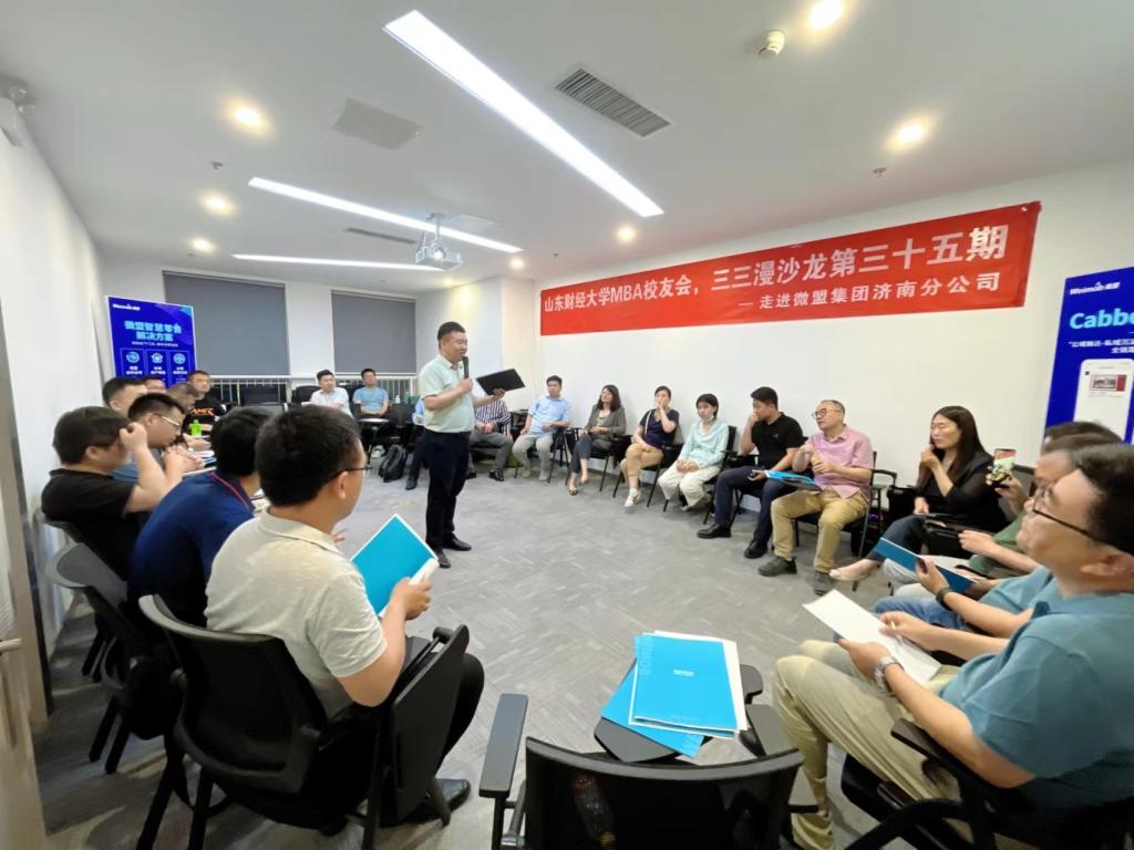 2023年5月17日晚上7点,山东财经大学MBA校友会“三三漫沙龙”第三十五期活动在微盟集团济南分公司举行。山东财经大学MBA学院副院长孙文刚、孔鹏志,MBA学院教授李永春,山东财经大学MBA校友会副会长袁莉、微盟集团济南分公司总经理郝清凯,及各届校友20余人参加了次沙龙。沙龙由山东财经大学2021级学员、众创营(山东)企业服务有限公司总经理魏同业主持。