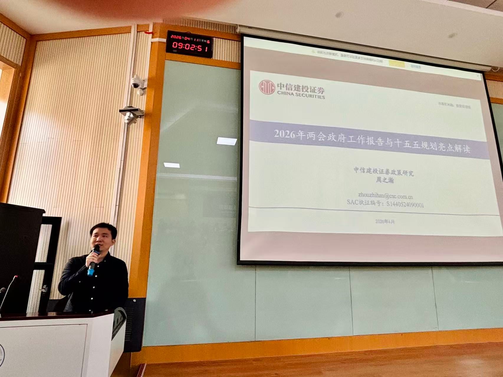 4月11日上午,山东财经大学MBA学院鲁商大讲堂第149期在舜耕校区举行,中信建投证券政策宏观分析师周之瀚作了题为《2026年两会政府工作报告与十五五规划亮点解读》的专题讲座,MBA学院院长彭留英主持讲座,MBA学院合作发展部副主任史萌、学院师生、校友代表等180余人参加活动。