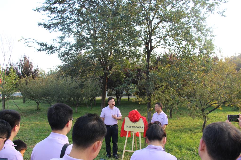 分论坛后,四十余位校友乘坐大巴前往山东财经大学圣井主校区参加了MBA校友林揭牌仪式,MBA学院副院长李琪、校友会会长丁召华为校友林揭牌,校友工作办公室合作共建科科长何珅见证了揭牌,并带领大家参观了主校区。参观后,校友们体验了圣井校区网红餐厅。