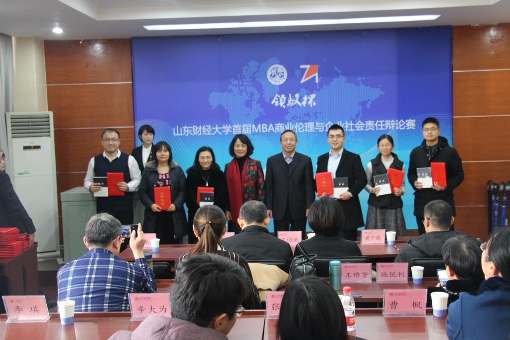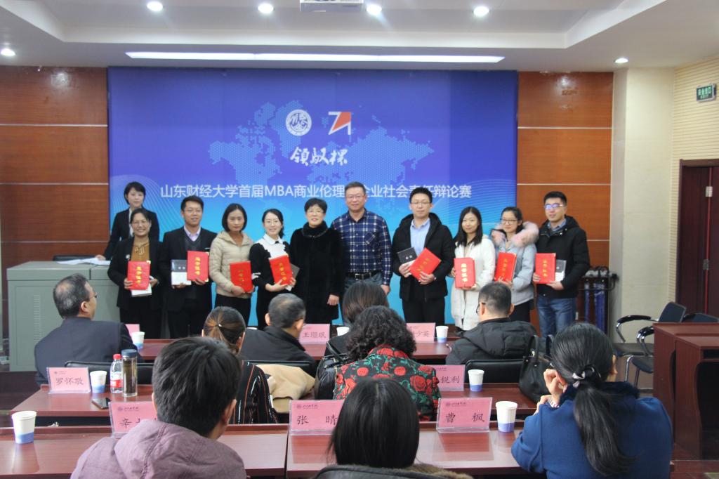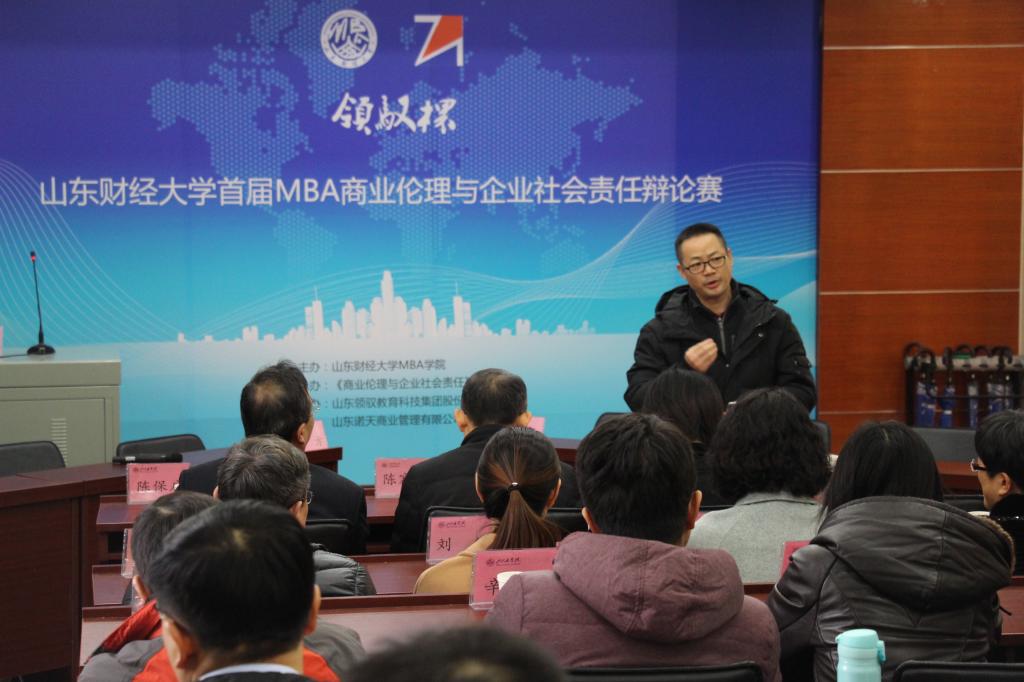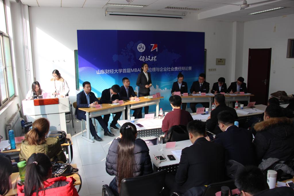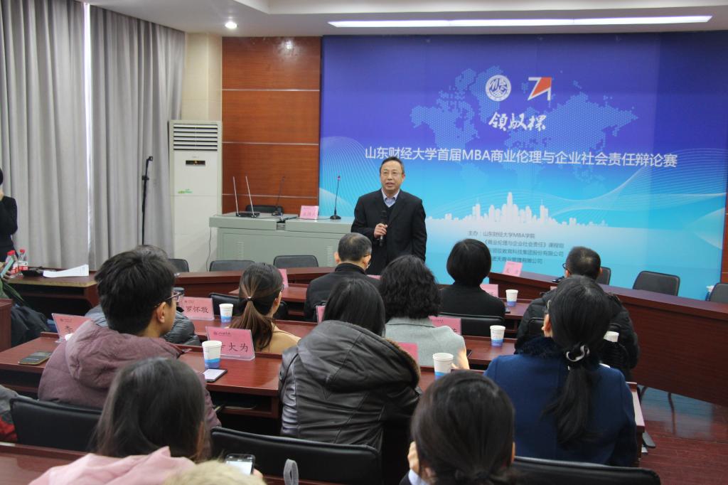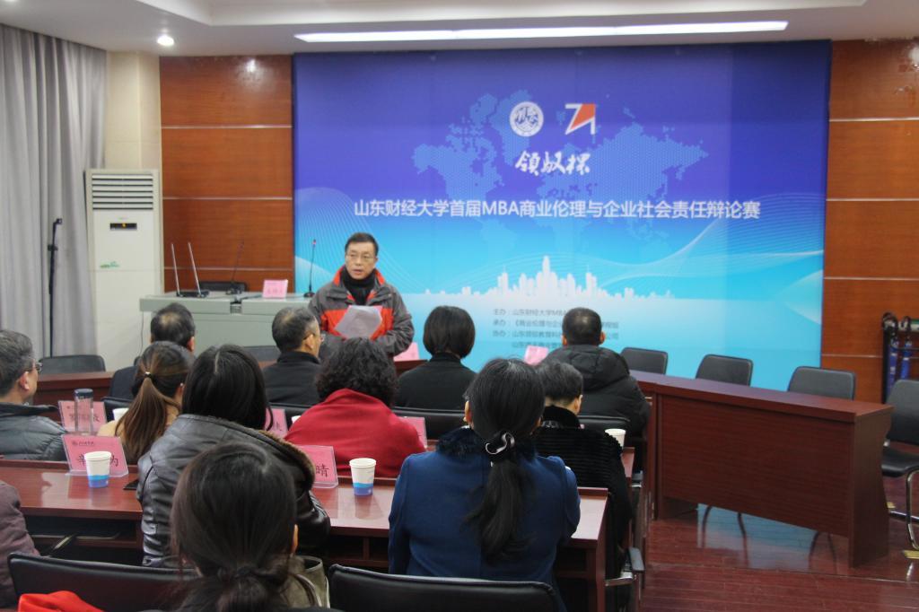 1月12日,山东财经大学首届MBA商业伦理与企业社会责任辩论赛在舜耕校区举行。此次比赛由学院主办,《商业伦理与企业社会责任》课程组承办。山东省司法厅辛大为,山东财经大学法学院王维芳教授、施锐利教授、曹枫讲师,工商管理学院陈寒松教授、张晴博士,课程组黄少英教授、王璟珉教授、刘侠副教授,学院院长陈保启,副院长罗怀敬、李琪应邀担任赛事评审嘉宾。2018级199名学员参加了此次辩论赛。