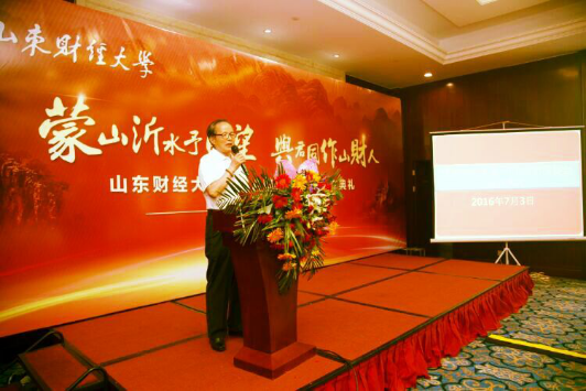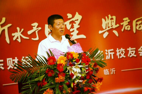 山东财经大学66届校友、原山东省中国银行财会处长、临沂市中行行长李成连上台致辞,对MBA临沂校友会的成立表示祝贺,并希望成为引领临沂校友的一面旗帜。