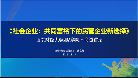 12月10日,社企星球集团培训总监、社企星球(成都)CEO姚克俭应邀为MBA学员做了题为《社会企业:共同富裕下的民营企业新选择》的线上专题讲座。讲座由《商业伦理与企业社会责任》课程组王璟珉教授主持,课程授课教师团队和2021级、2022级全体学员聆听了本次讲座。