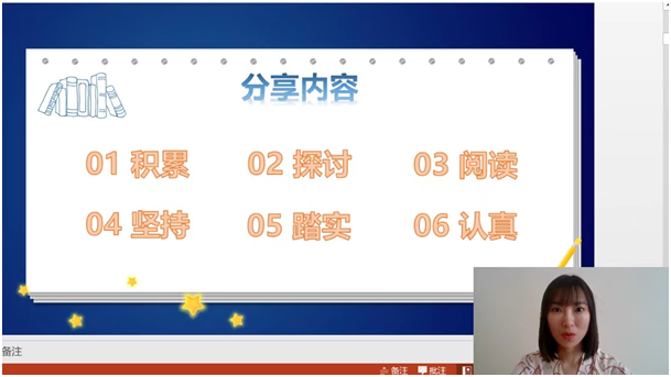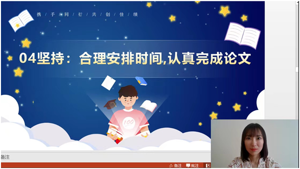 在分享会上,闫怡文同学根据自身学习经历、学习工作中遇到的困扰,在如何撰写学位论文,如何树立良好的求学心态,如何充分利用学院提供的各种资源等方面,与大家分享了她的一些心得体会。她认为,学习就要做到积累、探讨、阅读、坚持、踏实、认真。积累就是平时的课堂学习和作业实践;探讨就是与导师、同学交流互动;阅读就是总结前人的研究思路和成果;坚持就是合理安排写作时间并持之以恒;踏实就是“强健”论文内容、淬炼成金;认真就是全力以赴、心有所期必有所成。