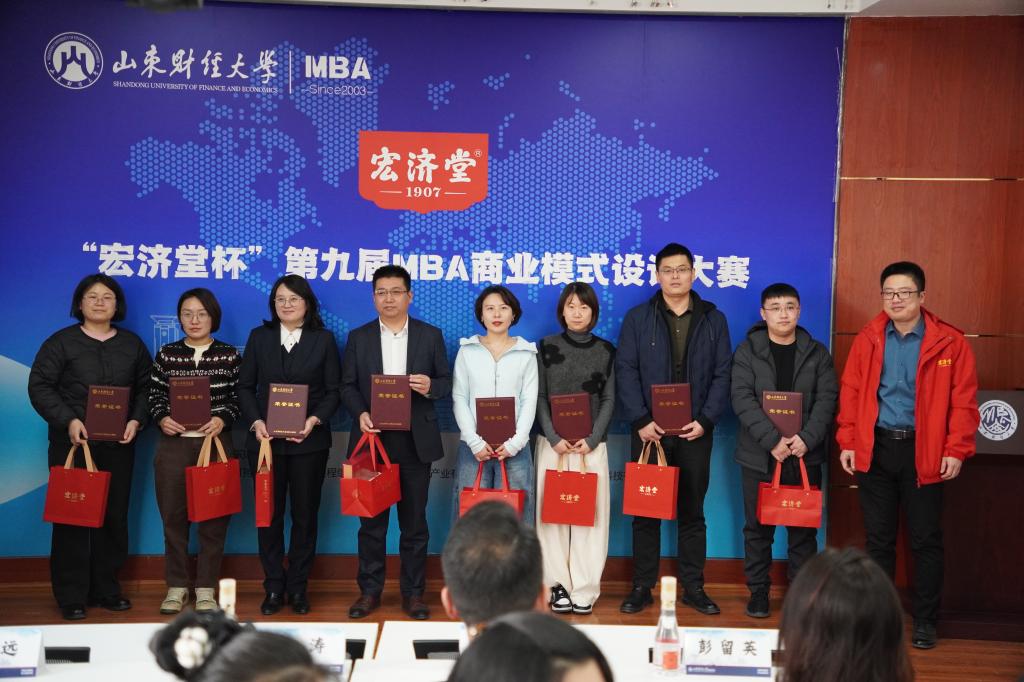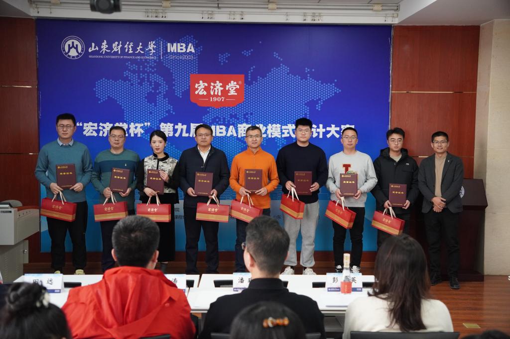 1月5日上午,“宏济堂杯”山东财经大学MBA学院第九届商业模式设计大赛在舜耕校区举行。此次比赛共有24支队伍、180余人参加。山东宏济堂健康产业有限公司销售总监王涛,三千锦礼网络科技有限公司董事长潘建飞、总经理李天龙,中高创投科技有限公司董事长徐恩泽,《可持续创业管理》课程组李新路副教授、齐齐博士,公共管理学院党委书记田远博士等担任此次大赛评委。