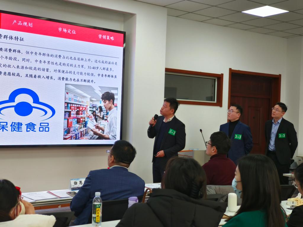 24支参赛队伍按照随机抽签顺序进入三个分赛场展开角逐。比赛以“宏济堂百年药企品牌如何赋能食品产业发展/宏济堂产品策略”为主题,各参赛队伍根据前期市场调研及头脑风暴形成的设计思路,从价值主张、客户细分、渠道通路、客户关系、核心资源、关键业务、重要伙伴、收入来源与成本结构等不同角度切入,配合展示了精彩方案,赛场不时爆发出阵阵喝彩。评委们的提问与精彩点评,引导同学们深入思考,深化认知。闭幕式上,田远代表课程组进行了赛事点评。他对各参赛队伍的表现给予了高度肯定。他表示,参赛队员赛前到企业参访深化了对企业的了解,并能结合课堂上讲授的相关理论,使得这次比赛呈现出很好的效果。最后,潘建飞、王涛、李天龙分别为冠、亚、季军9支获奖团队颁发了荣誉证书及奖品。