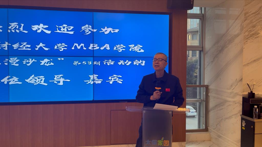 2月26日下午,山东财经大学MBA学院“三三漫沙龙”第53期在中国太平洋人寿保险股份有限公司山东分公司成功举办。本次活动以“国家个人养老金政策解读及企业与个人规划”为主题,由山东财经大学MBA校友会、济南市新兴产业协会、中国太平洋人寿保险股份有限公司山东分公司联合举办。中国太平洋人寿保险股份有限公司济南中心支公司总经理闫锡铭、副总经理张瓛,MBA学院党委书记高峰、副院长张禹,教学管理部主任孔鹏志,MBA校友会副会长袁莉,以及MBA校友30余人参加。